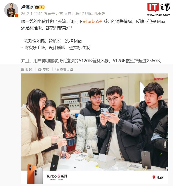 IT之家2月2日消息,小米集团合伙人、总裁,手机部总裁,小米品牌总经理卢伟冰昨晚发文透露了REDMITurbo5系列的销售情况,称一线反馈不论是Max还是标准版,都卖得非常好。